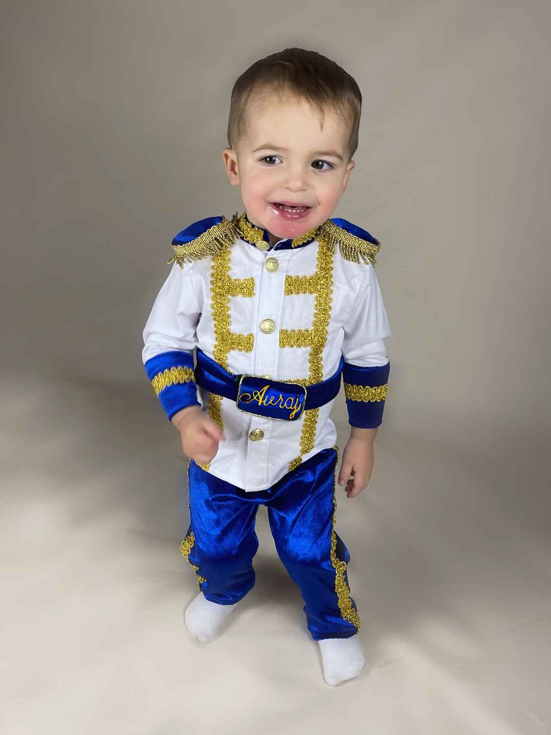 Make your little prince shine on his first birthday with our handmade Royal Blue Velvet Suit! This luxurious Prince Charming costume features elegant gold accents, perfect for a royal-themed celebration.