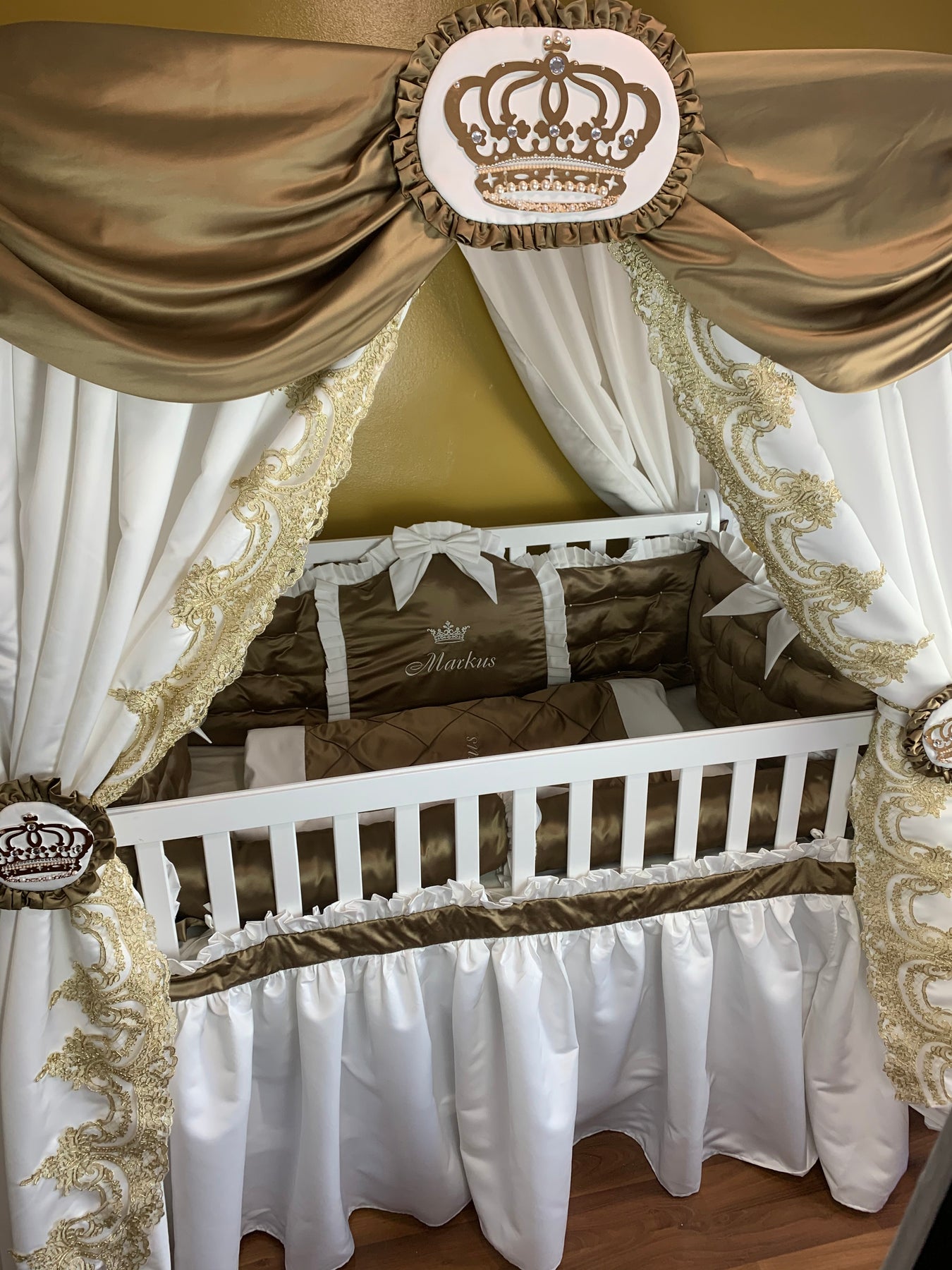 Gold Baby Boy Crib Bedding Set with Lace & Canopy