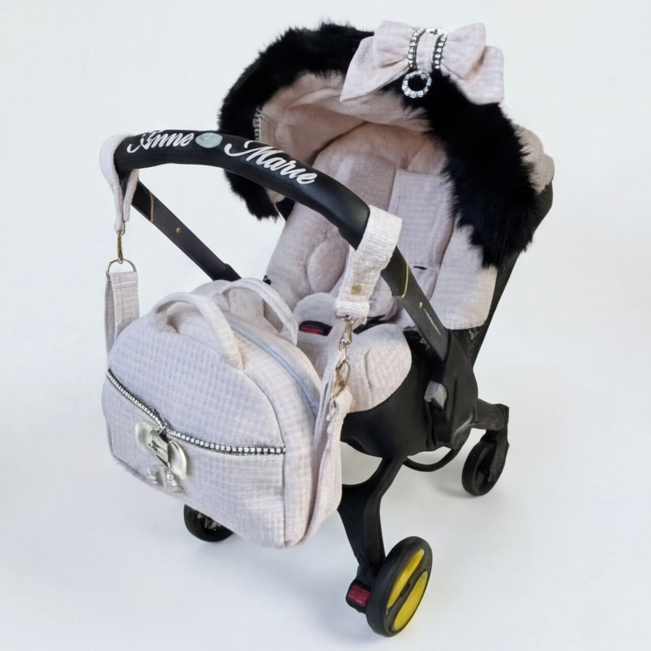 Front view of a baby car seat installed on a stroller frame, upholstered in light pink tweed fabric. The canopy is trimmed with real black fur and decorated with a light pink bow. The carry handle features embroidered text “Anne Marie.” A matching padded footmuff is attached. Displayed on a plain light background.